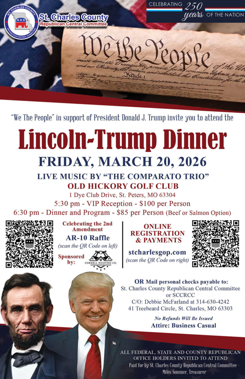 Are you a proud American? Then join us for the Lincoln Trump Dinner on March 20th at Old Hickory Golf Club in Saint Peters, hosted by the Saint Charles County Republican Central Committee. The evening features a VIP reception, dinner, and program with live music by the Comparato Trio.